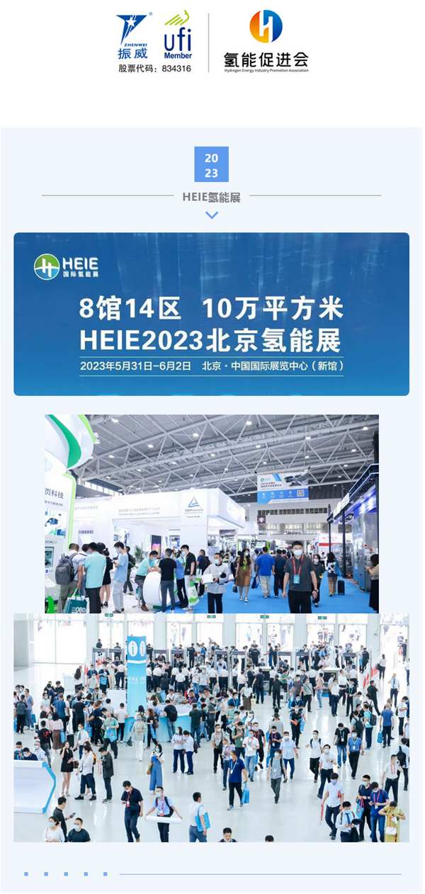 2023北京国际氢能技术装备展览会(简称:HEIE2023)由中国产业发展促进会氢能分会和振威展览集团联合主办。将于5月31日-6月2日在北京•中国国际展览中心(新馆)举行。展会设“8馆14区”,总展览面积10万+平方米,预计参展企业1800余家,其中世界500强企业46家,国际展团18个,参观人数将达12.3万人次。