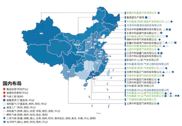 中科富海总部设立在北京,目前已成立25家分子公司,在鄂尔多斯建立BOG提氦示范工厂,在安徽阜阳建设高纯稀有气体工厂和大型液氢工厂,在广东中山建设集空分装置、高纯电子特气、氦气分装、制氢于一体的综合气体岛,在河南、山西、江苏等地为多家化工、钢铁、光伏、锂电池等企业提供了9万、3万、1万等级的空分装置和管道供气等服务,形成以设备研发、集成制造、EPC工程总包、工厂运行、气体服务为一体的民族供应商。中科富海已实现在大型低温装备与低温工程、战略氦资源及高纯稀有气体、氢能产业、高纯电子特气与工业气体五大业务板块规划布局,奠定其在全国大鄂尔多斯盆地、京津翼、长三角、珠港澳大湾区重点区域的长远发展。