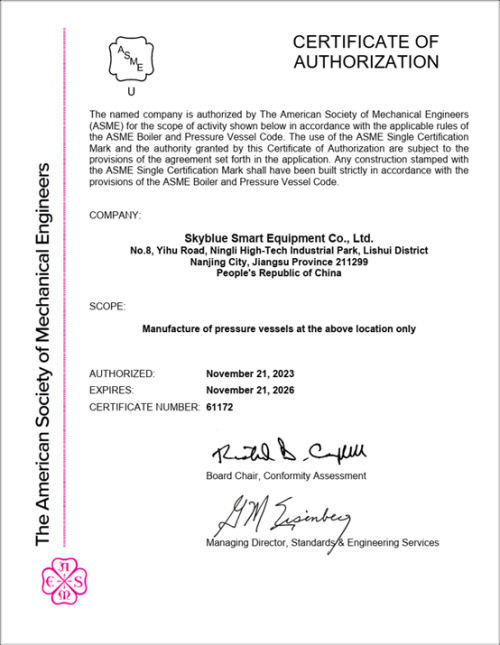 2023年11月,工厂获得ASME认证,证明天蓝智能公司有能力制造出符合ASME规范要求的产品。